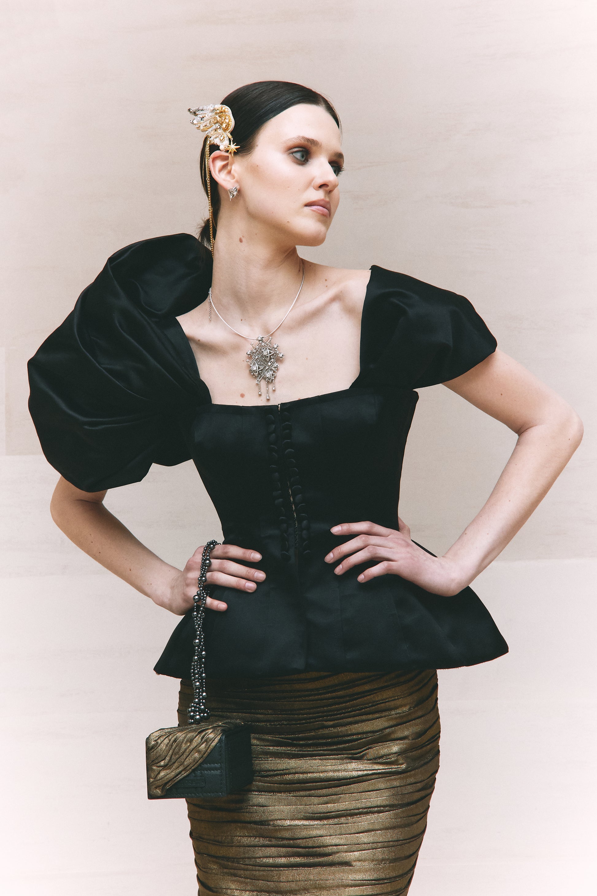 Couture handbag in genuine leather, Swarovski pearls, silver hardware, one large compartment and a back pocket, magnetic closure.