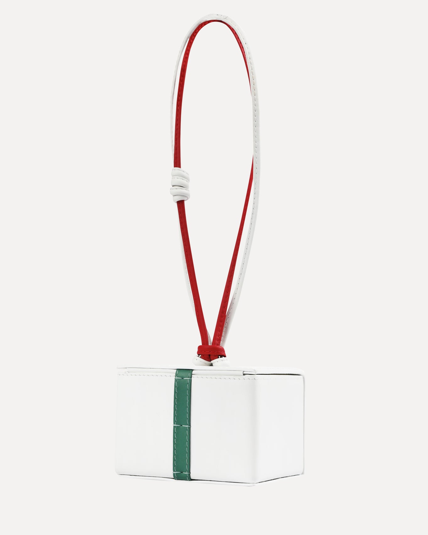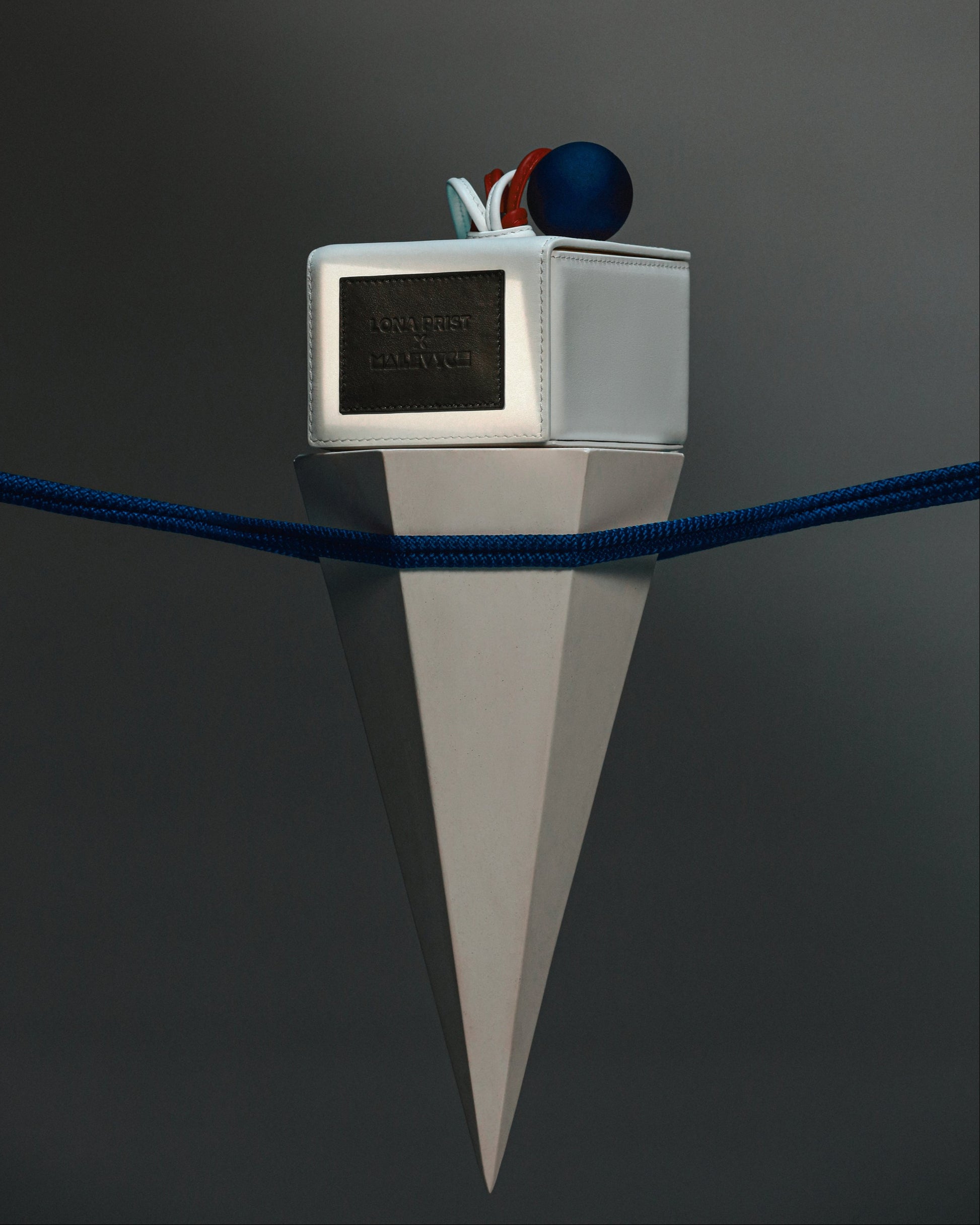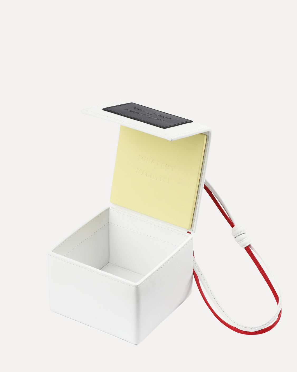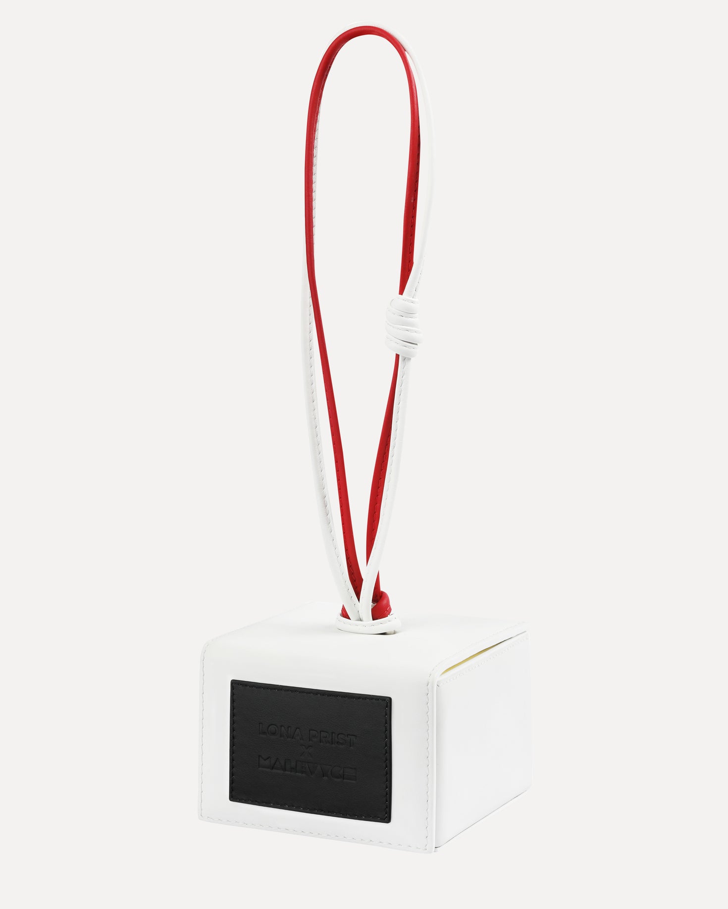 Matte white (off-white) leather, calm and minimalistic, like a canvas before a gesture. A bold black patch with the collaboration logo serves as a visual anchor — a square within a square, a subtle reference speaking the language of archetypes. The strap is multicolored, with knots that balance between construction and associative play: red and white — the colors of Suprematism — transformed into a dimensional accent.