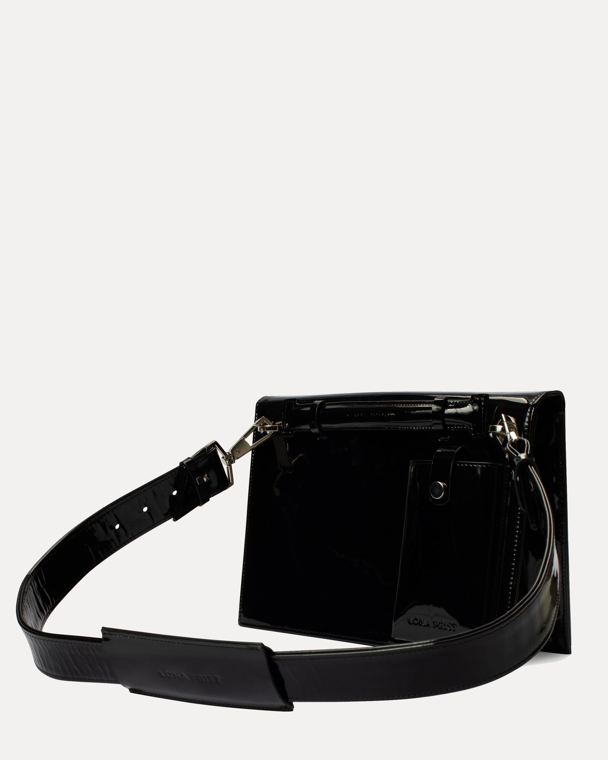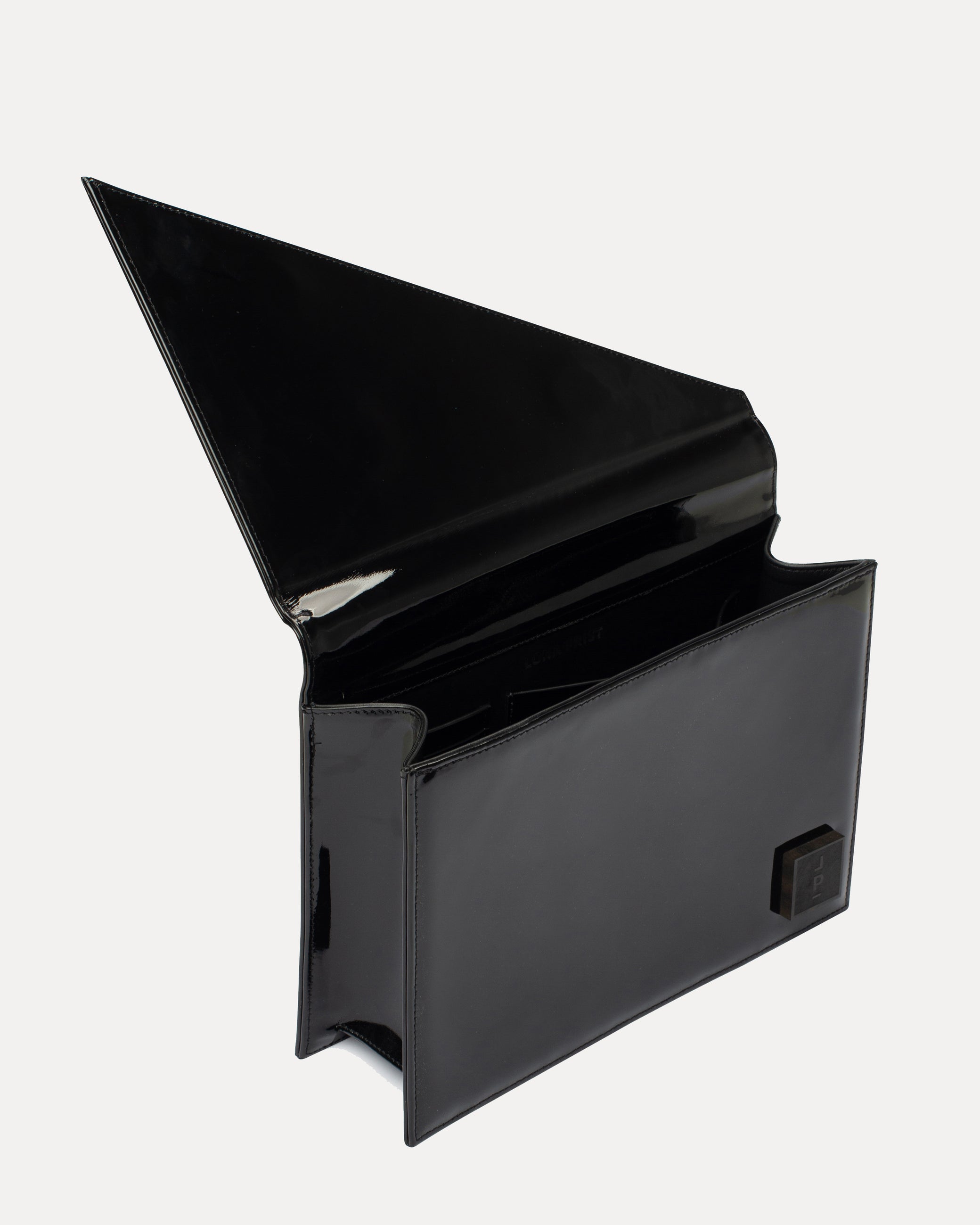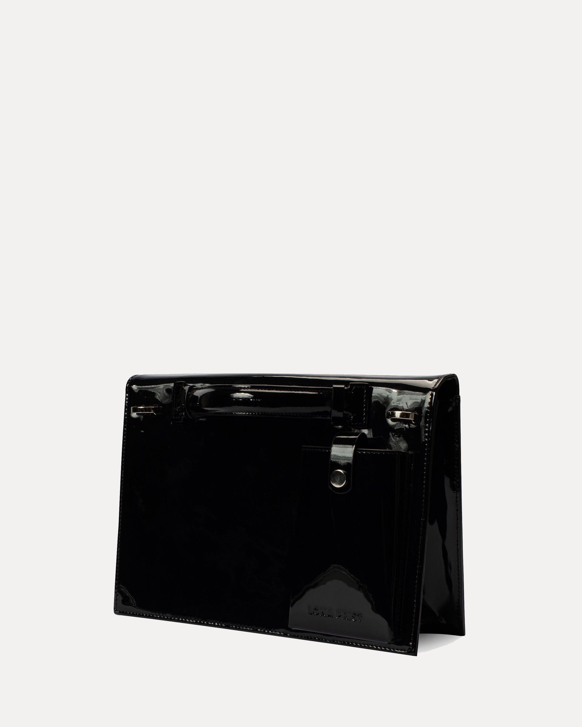 Clutch in genuine Italian patent leather, with leather lining and silver hardware. Includes a detachable leather strap for shoulder or crossbody wear.