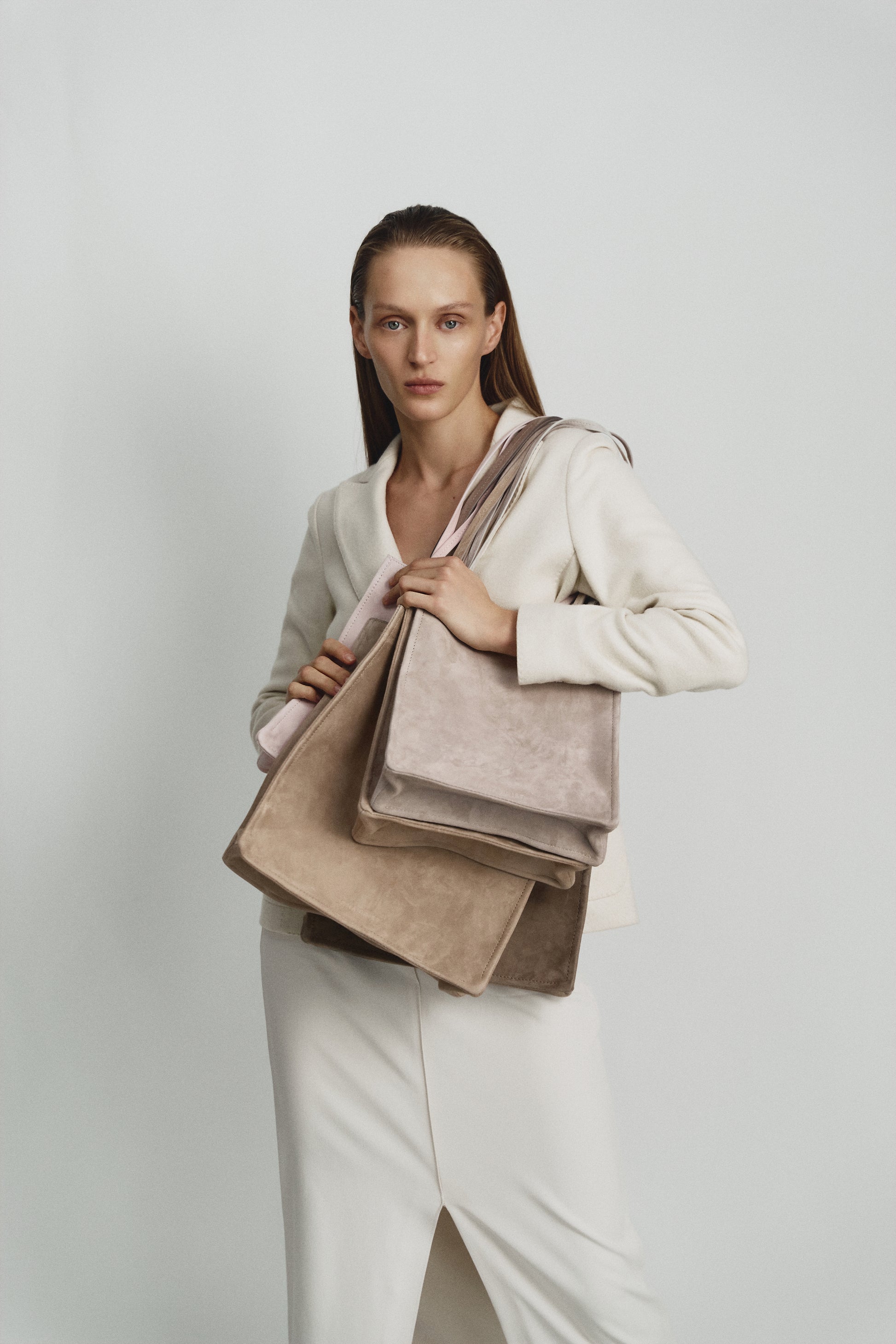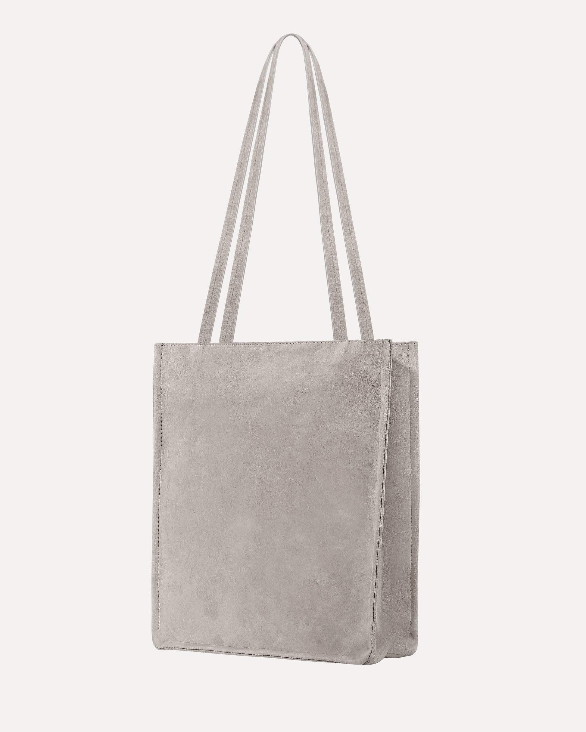 Small tote bag in genuine suede, with suede lining, silver hardware, and magnetic closure.