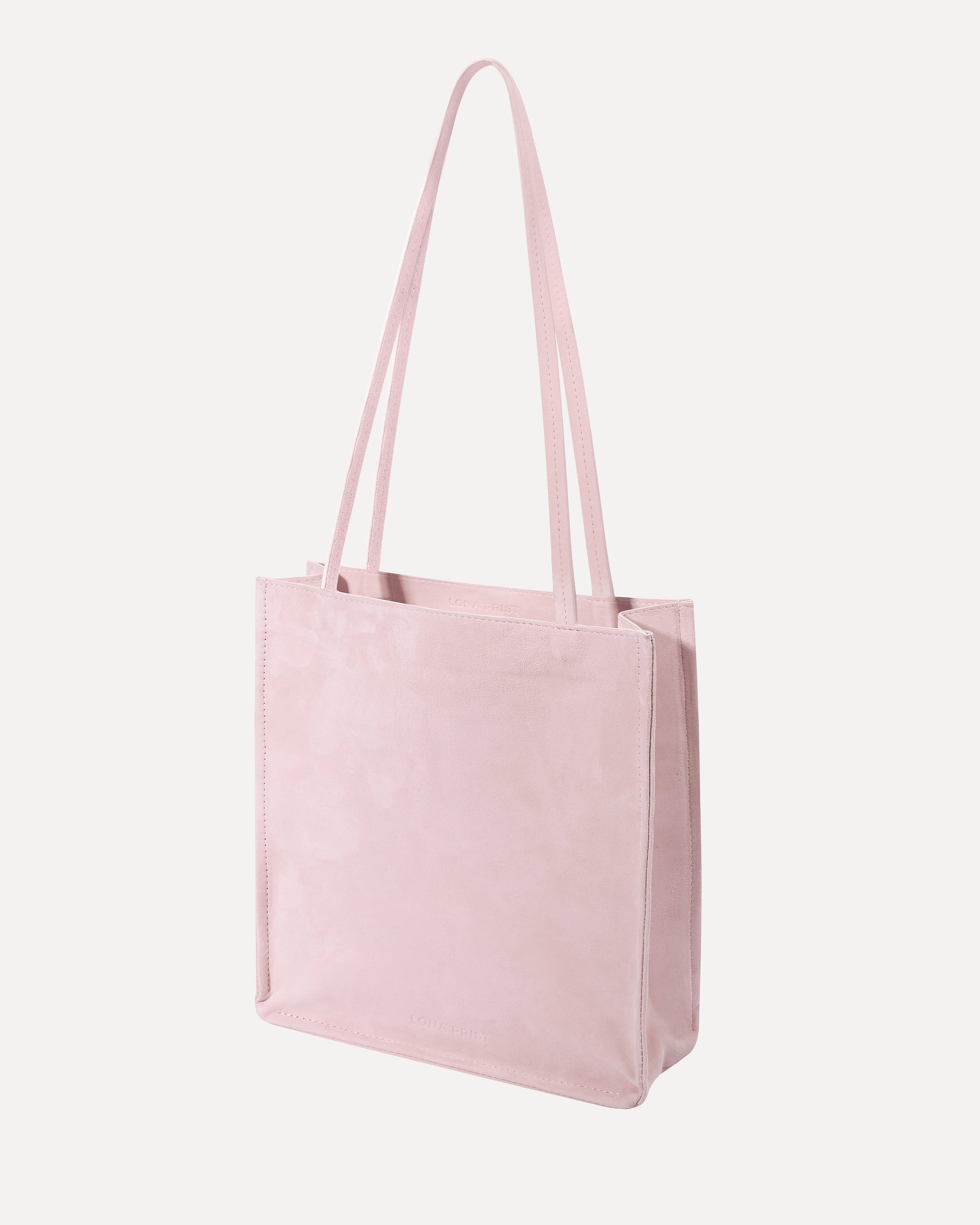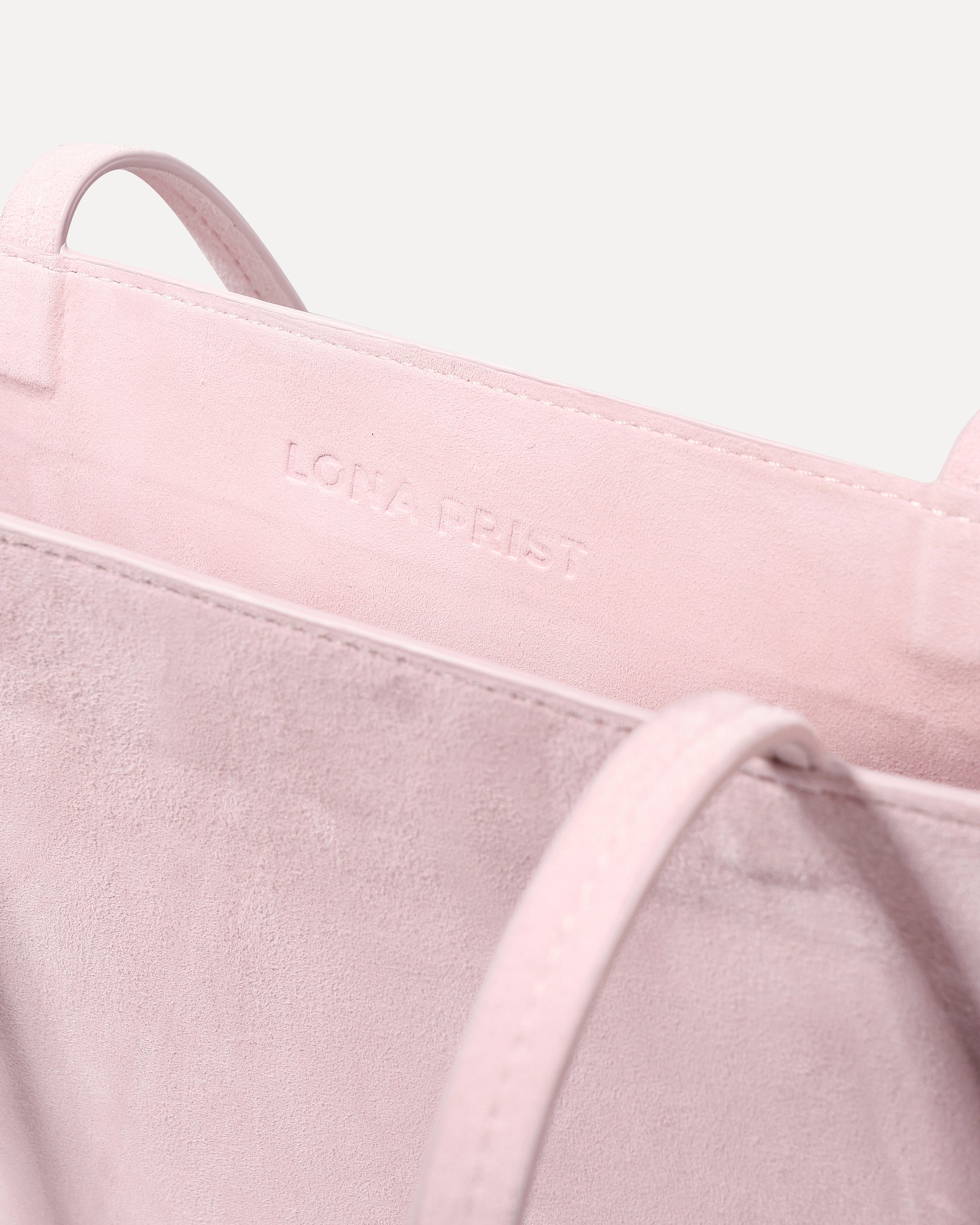 Small tote bag in genuine suede, with suede lining, silver hardware, and magnetic closure.