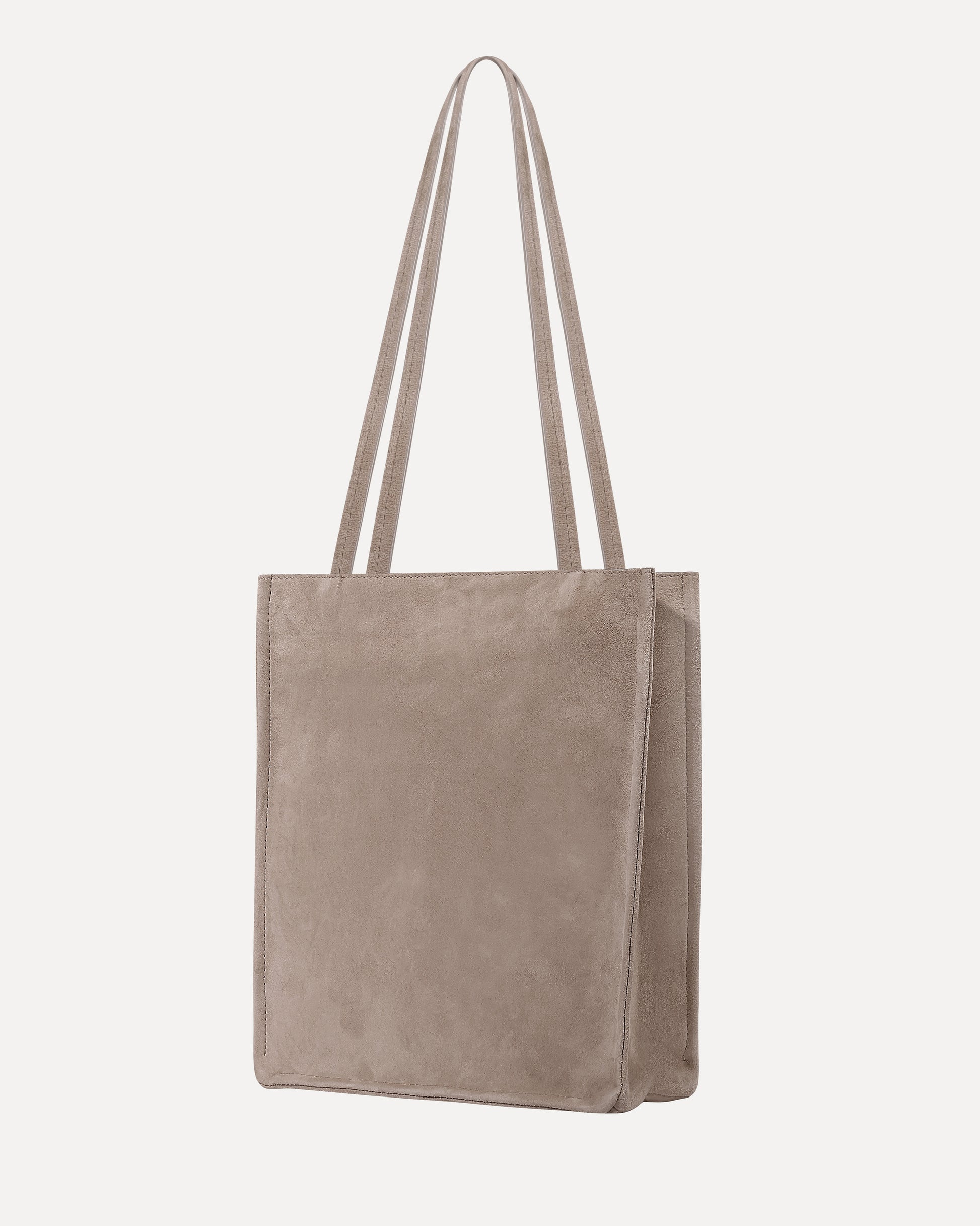 Small tote bag in genuine suede, with suede lining, silver hardware, and magnetic closure.
