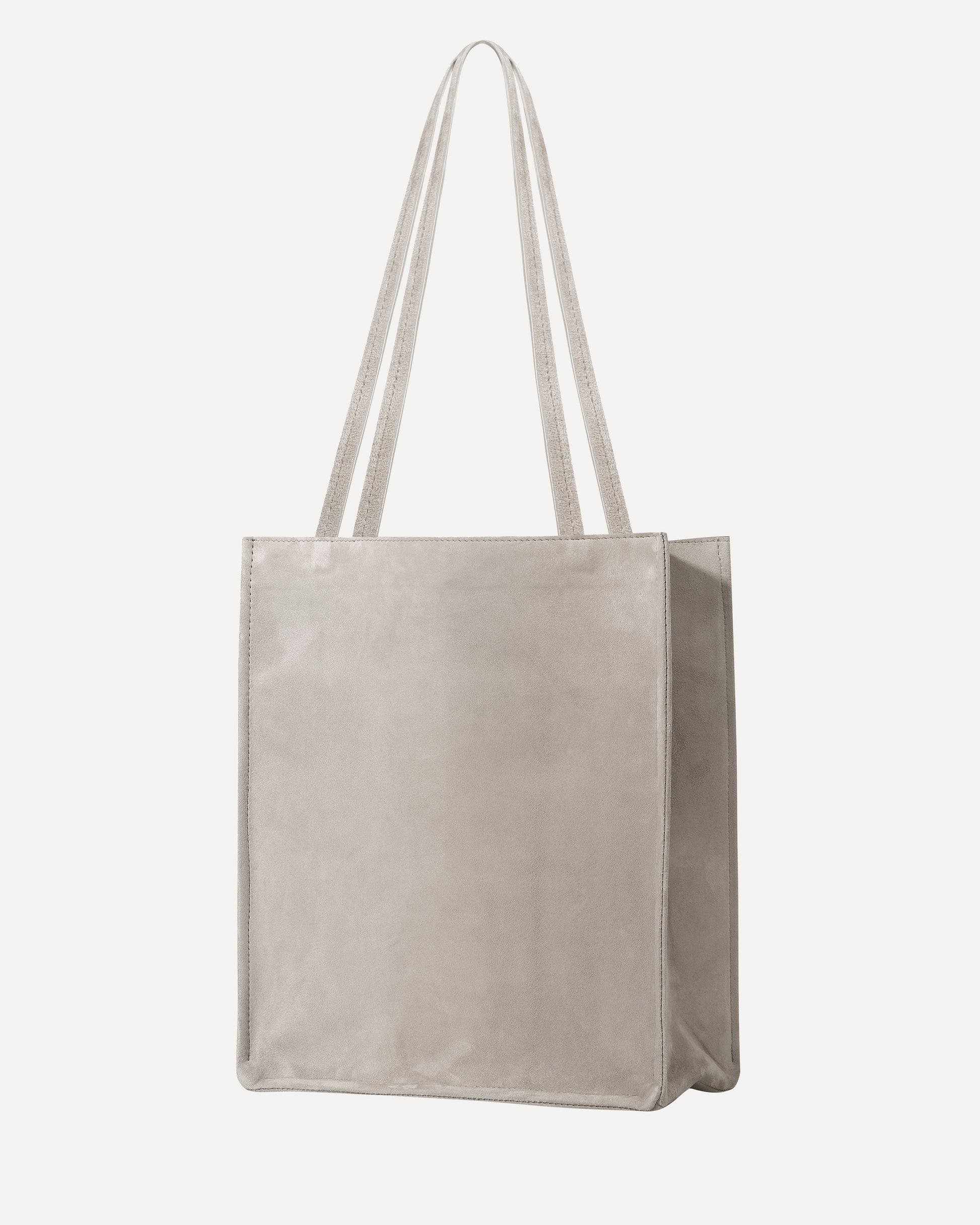 Small tote bag in genuine suede, with suede lining, silver hardware, and magnetic closure.