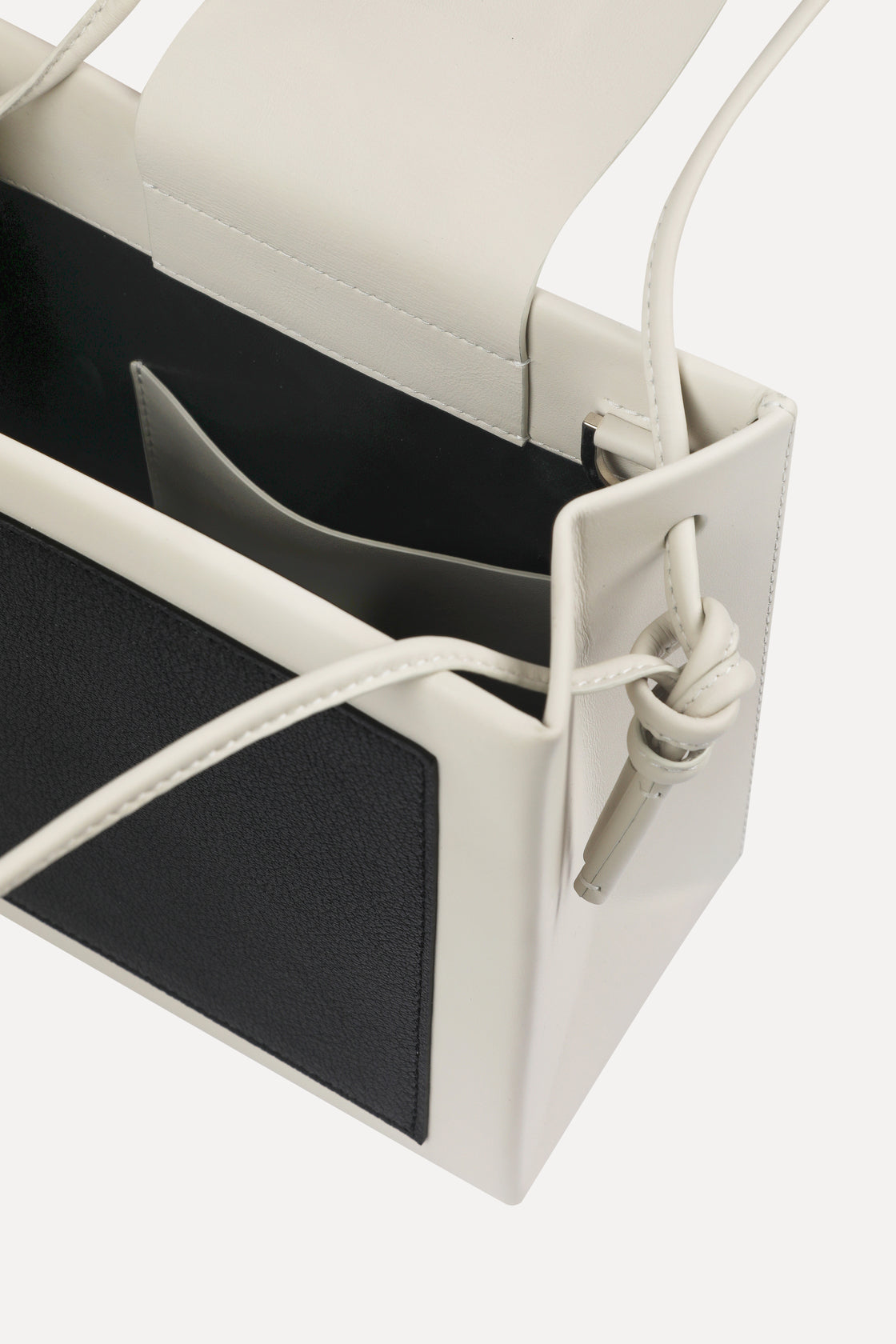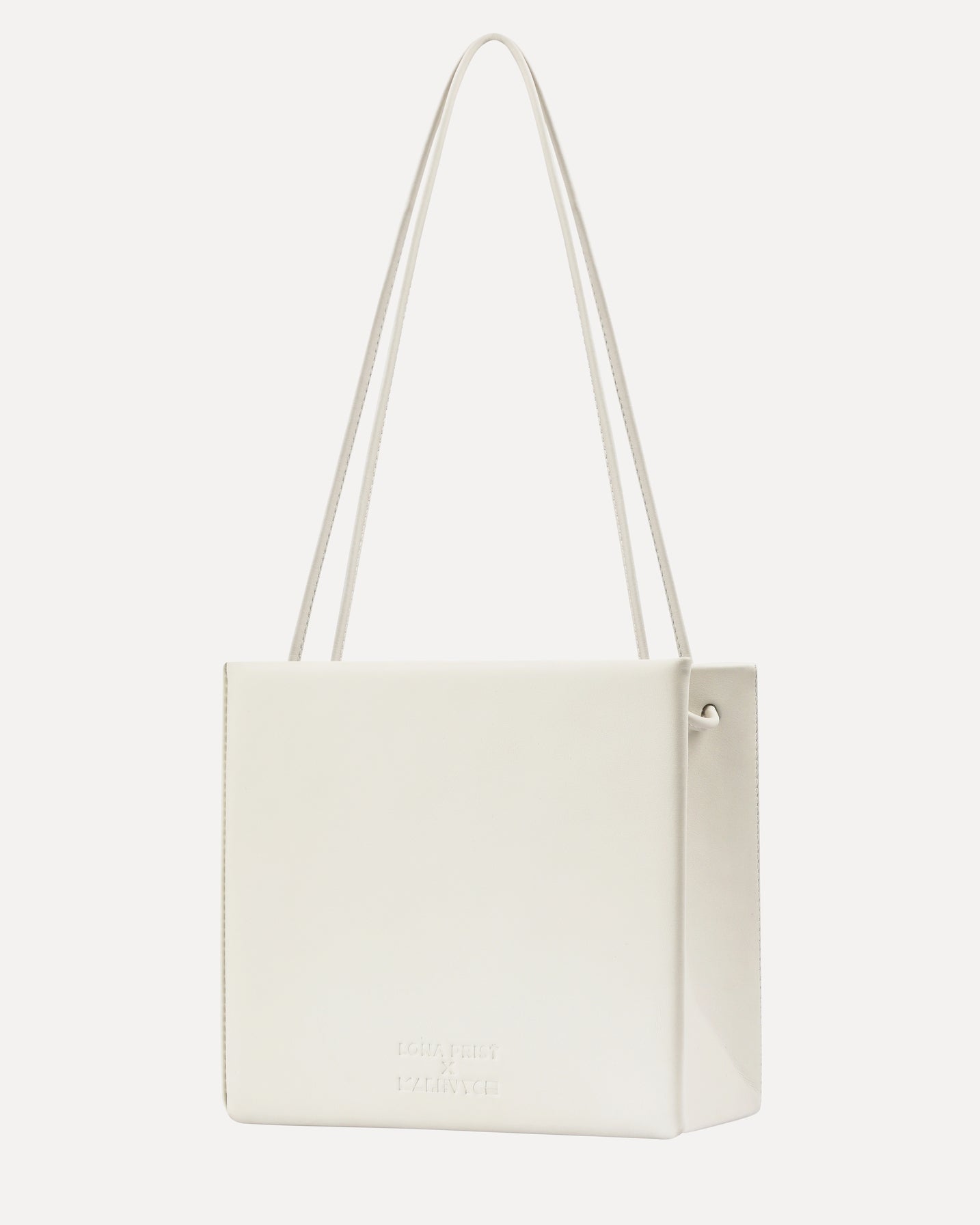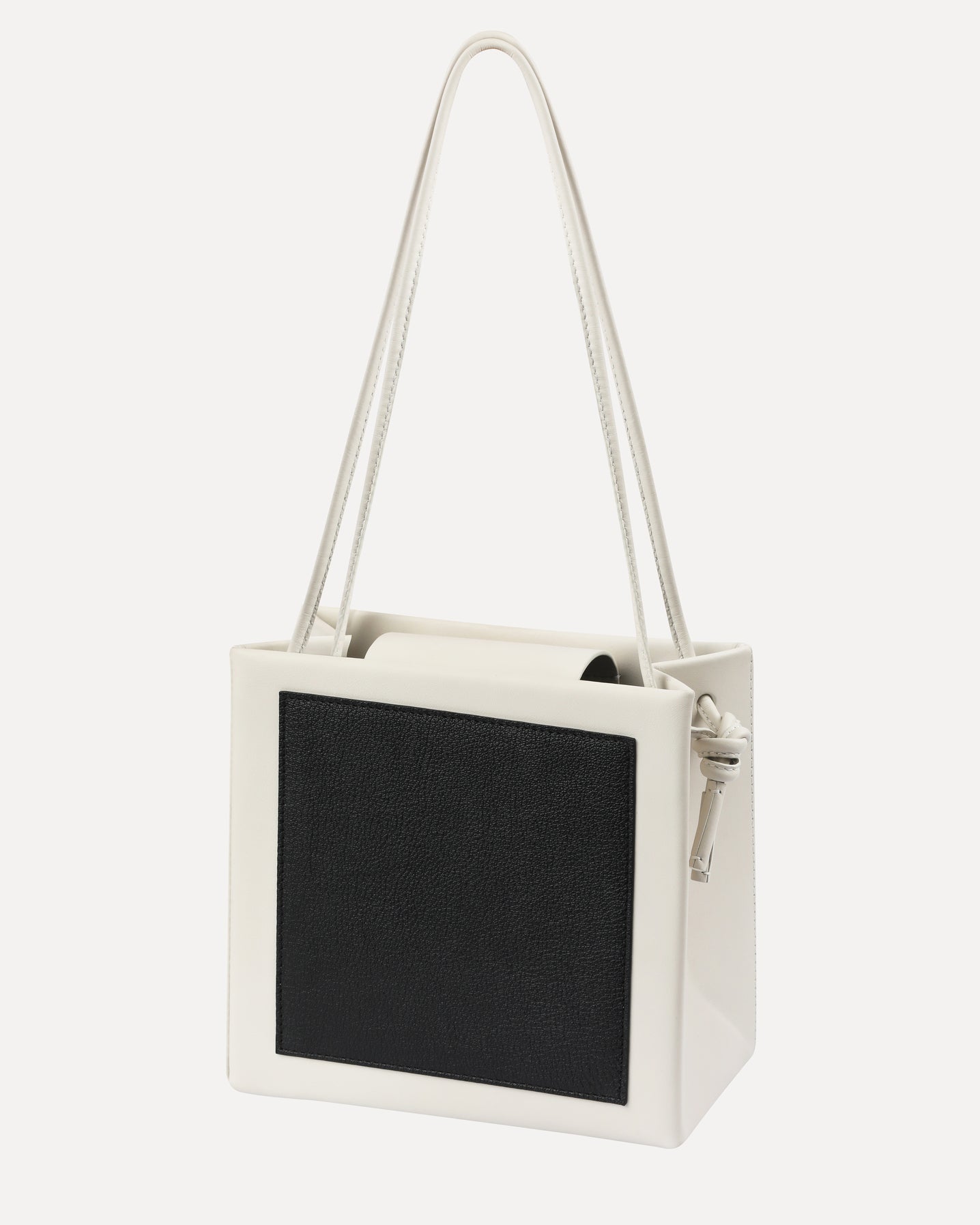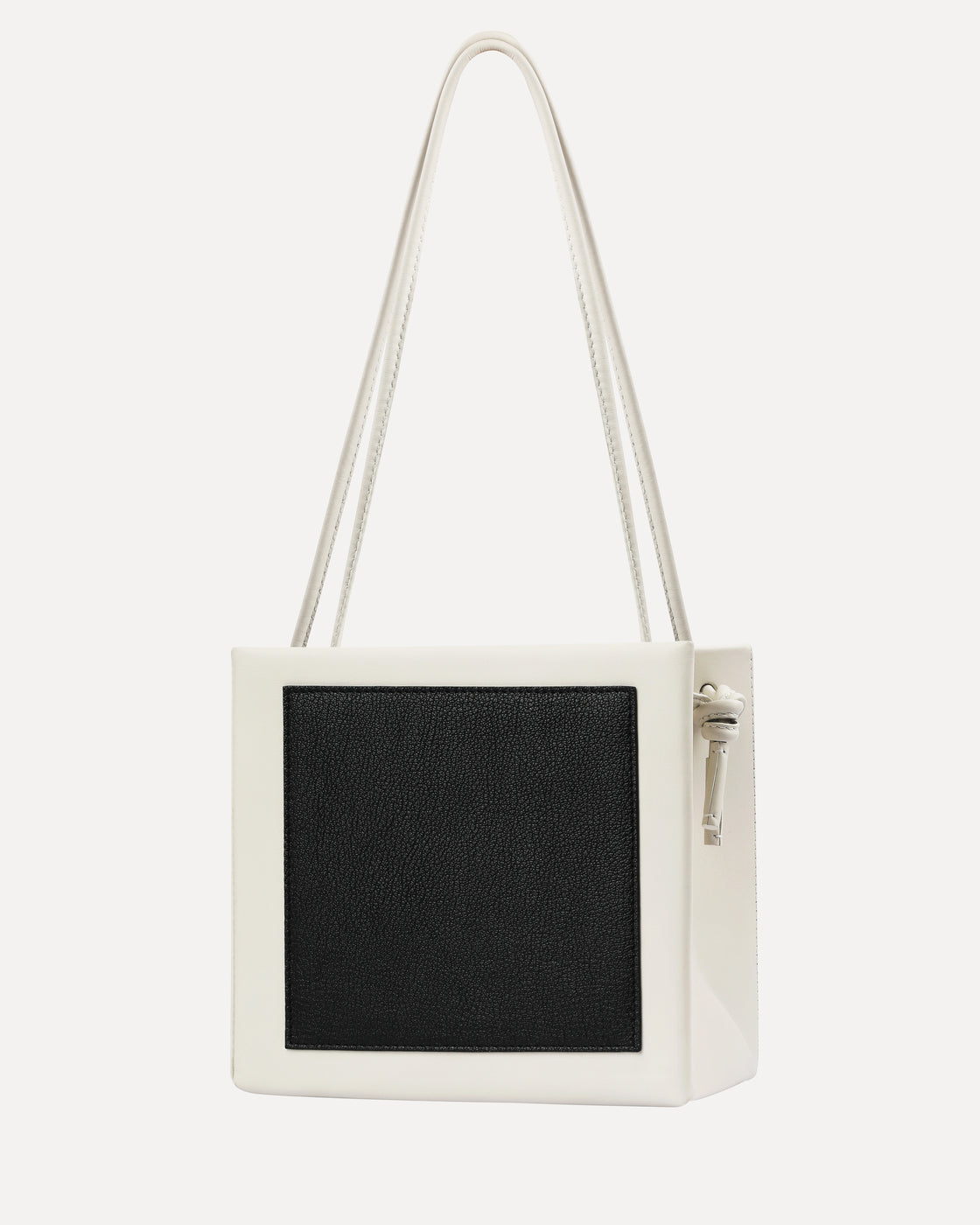 Це сумка-жест, сумка-маніфест. Нічого зайвого — лише форма і контраст. Біла основа (off-white) з гладкої шкіри підкреслює сувору текстуру чорного квадрата, ніби створюючи рамку для тиші, яку цей символ несе вже понад століття.